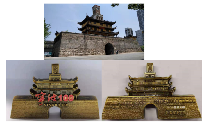 宁波100致力打造成为一个有文化的赛事,上届开始,完赛奖牌不仅一改传统挂件为摆件,同时选择了宁波地标作为奖牌模型。去年奖牌创意灵感来自宁波三江口宁波海上茶路启航地的纪念碑。