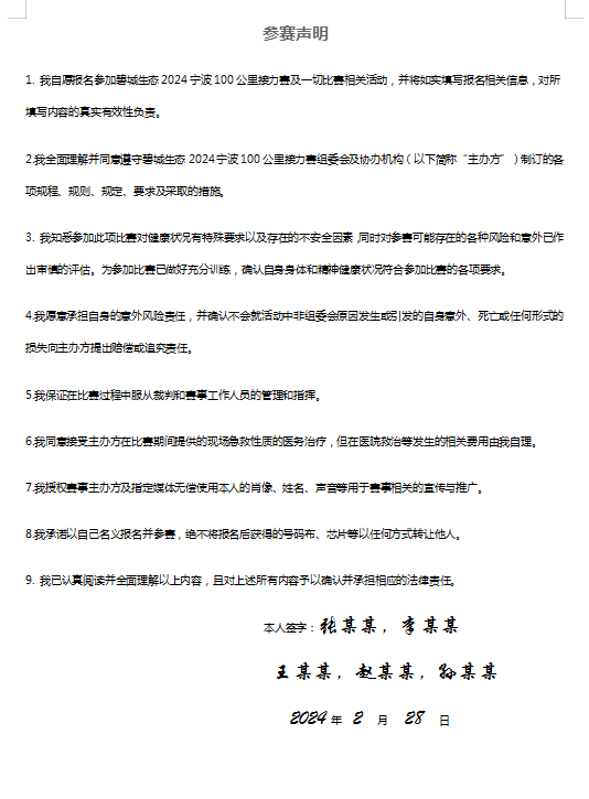 1、团队编号、团队名及全体队员签字的《参赛声明》(文末附件下载,可签在一份参赛声明,也可分开签署)