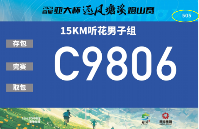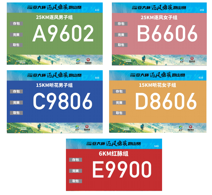 因本次赛事参赛号个性化编排(生日或手机尾号),为了方便参赛包领取、存取,每个号码布右上方有一个顺序号,它既是装备领取时的领取号,又是比赛现场部分奖品的抽奖号。