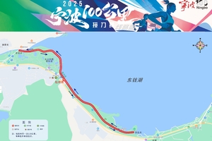 东钱湖南岸绿道循环。为了减少游客及进出逸帆停车场车辆影响,同时为了预防白色栈桥早晨结冰路滑风险,本届接力组线路略作调整,将西端折返点向西移,避开白色栈桥段,调整后线路为: